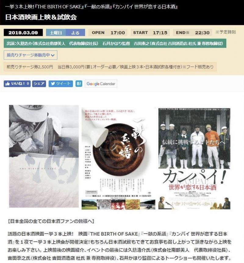 2019年3月9日に開催される日本酒の映画一挙3作品上映会イベントのチケットが見事に120枚完売したそうです!